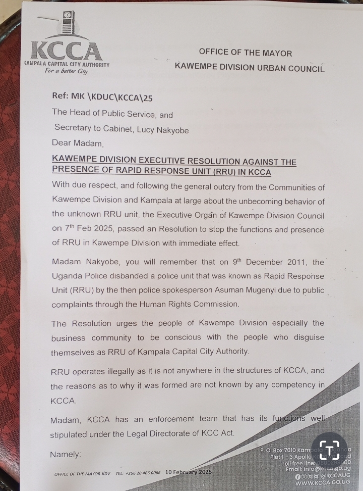 “With due respect, and following the general outcry from the Communities of Kawempe Division and Kampala at large about the unbecoming behavior of the unknown RRU unit, the Executive Organ of Kawempe Division Council on 7th Feb 2025, passed an Resolution to stop the functions and presence of RRU in Kawempe Division with immediate effect.” reads part of Mayor’s letter addressed to Lucy Nakyobe