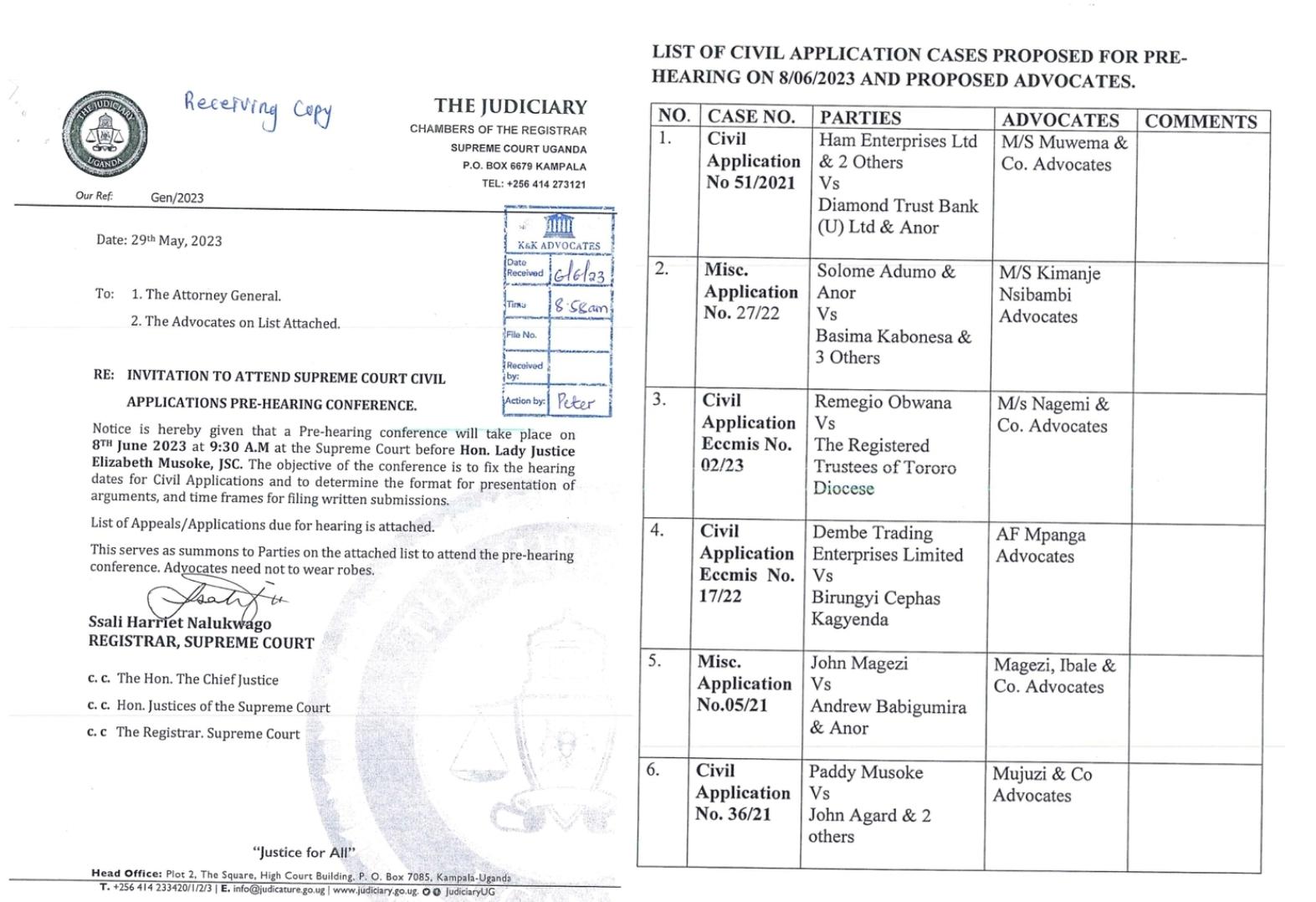 KAMPALA UGANDA| Following the Summons by supreme court on June 8, 2023 for Pre-hearing of the application for judgement on admission of illegalities not substantially addressed by court of appeal where unfortunately outside normal court procedure, Hon. Justice Elizabeth Musoke shocked court by saying the Chief Justice instructed her not to entertain the application but rather inform the applicants that delivery of judgement in the main appeal is on June 13, 2023 which is contrary to article 28 of the constitution which provides for the right to a fair, speedy and public hearing to all Ugandans by an independent and impartial court or tribunal established by law and equally contrary to article 44(c) of the constitution provides that Notwithstanding anything in the Constitution, there shall be no derogation from enjoyment of the right to fair hearing. So every Ugandan has the right to be heard.