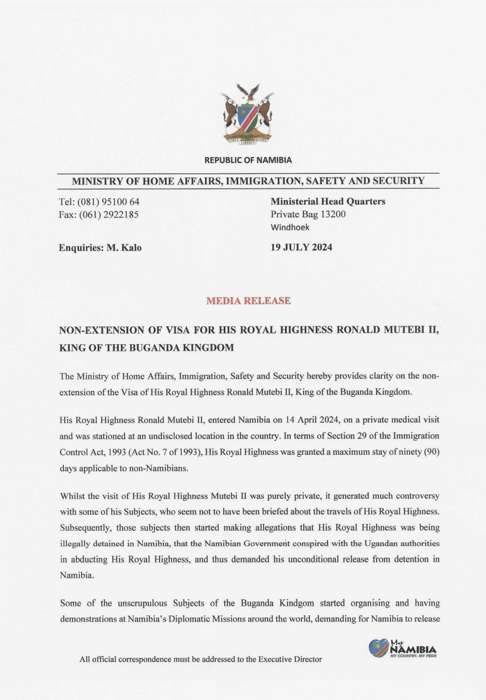In a press statement dated 19th, July, 2024 and signed by Etienne Maritz , the Executive Director of the Minsitry, revealed that the Kabaka entered Namibia on 14 April 2024, on a private medical visit and was stationed at an undisclosed location in the country until when his stay has caused a number of challenges to the country.