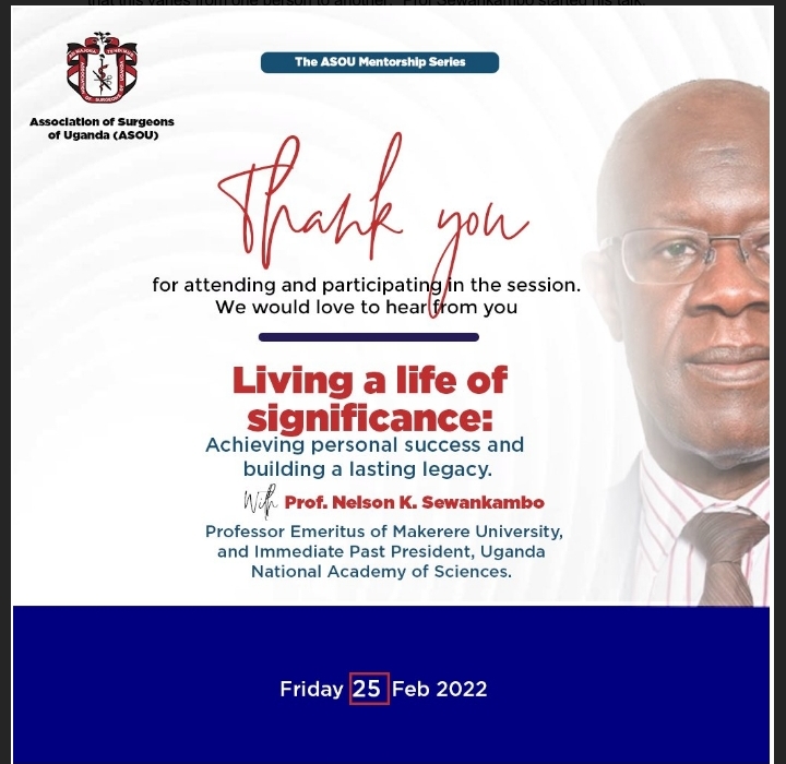 It was a virtual audience of over 600 people. The occasion – seventh series of the Association of Surgeons of Uganda mentorship talk. The speaker – Prof. Emeritus Nelson Sewankambo. The topic – ‘Living a life of significance and building a lasting legacy.’ At 3:30PM, the prayer drum rolled and the show started. This happened on Friday 25th February 2022.